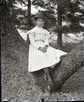 Mildred Perkins as a girl sitting in at tree wearing a white dress and hat.