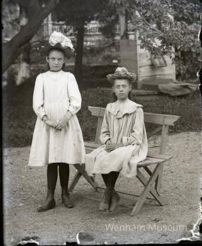 Marion Stanley and Mabel Sanborn from Salem photographed outside with a well in the background. One is standing and the other is sitting on a bench, and both wear hats.Collection