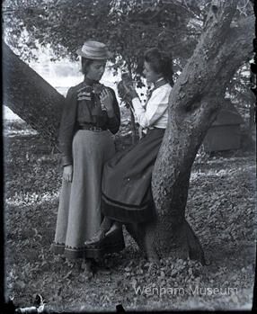 Carrie Lord and Mary Graham pictured outside standing by and sitting in a tree. Each of them holds a kitten.