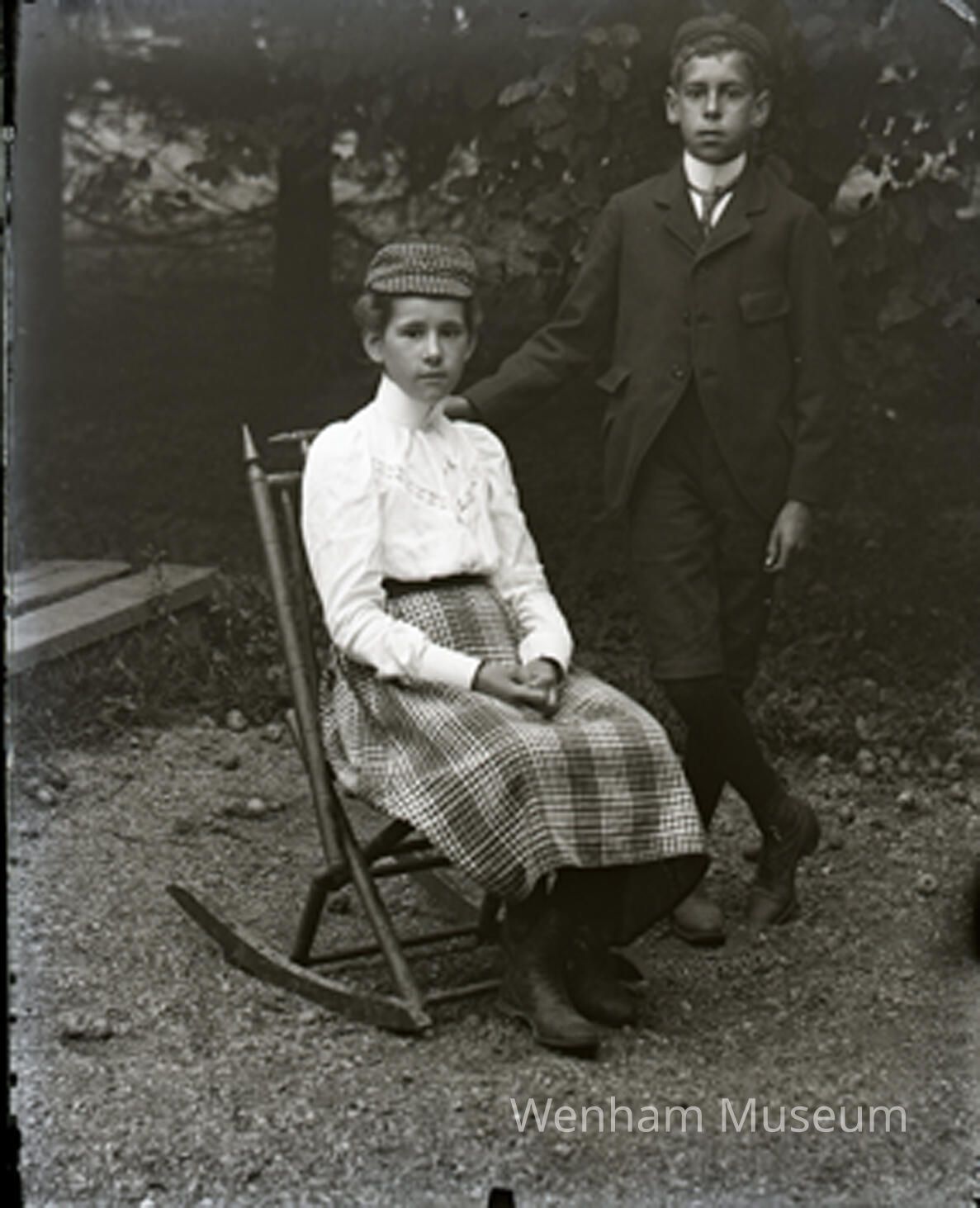 Flossie Vroom and Tommy Batten photographed as children outside. Flossie is sitting on a rocking chair.