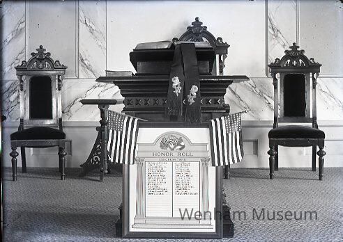 Wenham Congregational Church, Int., pulpit, chairs and WW I church Honor Roll, 137 Main St.