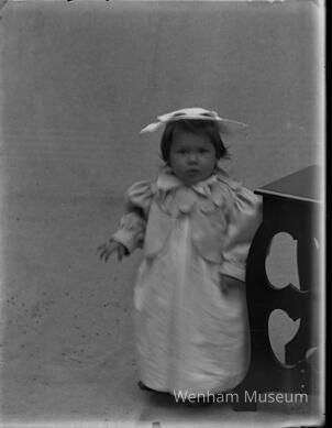 Toddler wearing a long dress, jacket with wide collar and puffed sleeves, and hat standing in front of a plain backdrop next to a table.Collection