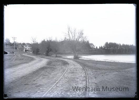 Landscape with Main St. and train tracks at foot of Pond Hill at Wenham Lake, December 19, 1891