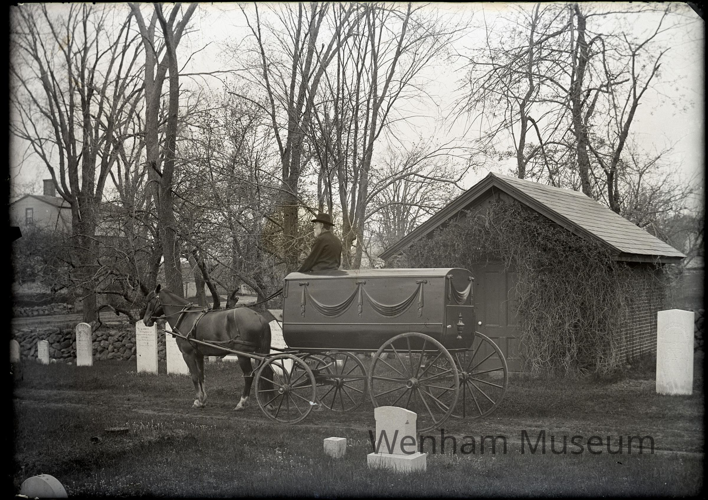 Landscape of Wenham Cemetery with Wellington Pool, sexton, driving a hearse at receiving tomb
