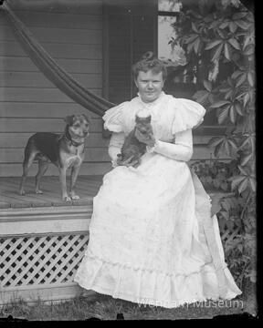 Mrs. George Perkins with cat and dog.