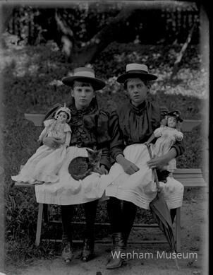Alice Kimball and Alice Merrill sitting with kittens and dolls.
