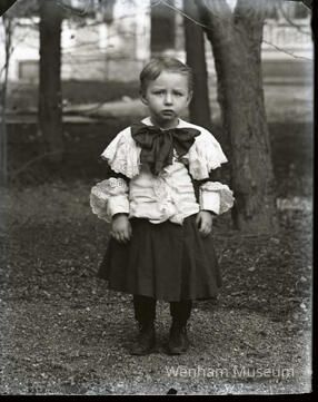 Portrait photograph of Jerome Flynn at age two years standing outside with an elaborate bowtie, ruffled lace shirt, and skirt, November 12, 1900Collection