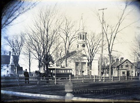 Landscape with Wenham First Congregational Church, 137 Main St., Monument Square and horse car heading West