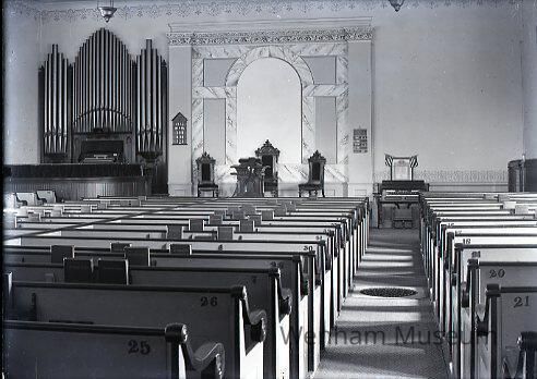 Wenham Congregational Church, Int., gen. view with pews and organ, 137 Main St.