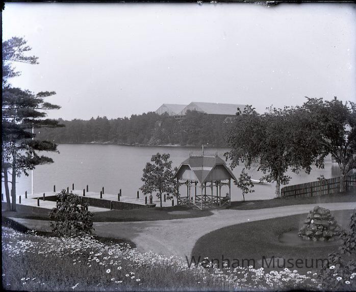 Landscape of Wenham Lake, park and docks at Salem Water Works, No. Beverly, gazebo and No. Beverly ice houses