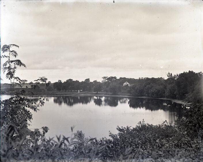 Landscape of Wenham Lake, mirror view to North with Beard Barn and Batchelder House, Main St.