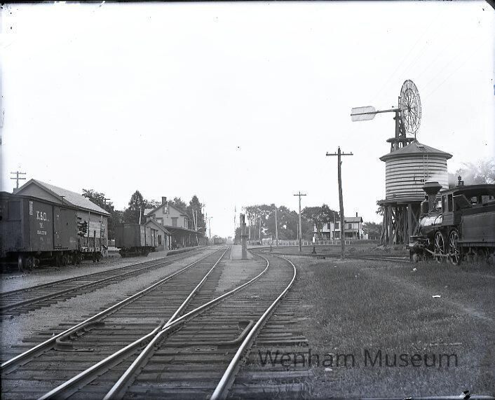 Landscape, Boston & Maine railroad, Wenham Depot, to North from Essex Branch turnoff, water tank and 4-4-0 American LocomotiveCollection