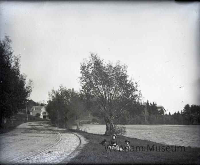 Landscape, Pond Hill with Pond House and Wenham Lake, woman, child and dog