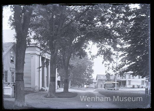Landscape with Wenham Congregational Church, 137 Main St., from front of Hobbs Harness Shop (135 Main St.), Trowt's Store, horsecar and Demsey Blacksmith Shop also visibleCollection