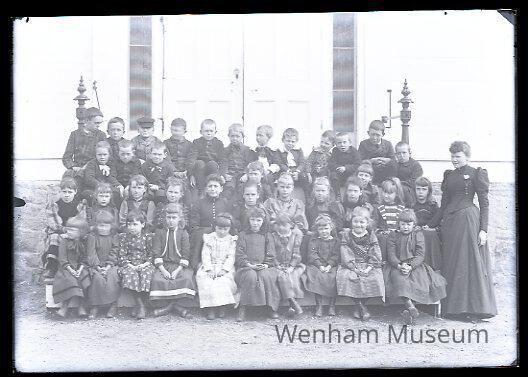 Primary school group on town hall steps, Miss Bertha Durgin, teacher, Wenham center