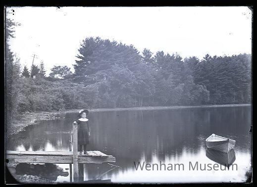 Wenham Lake, Pier at Eastern Shore along Main St., Landscape with a young child on a dock and a rowboat