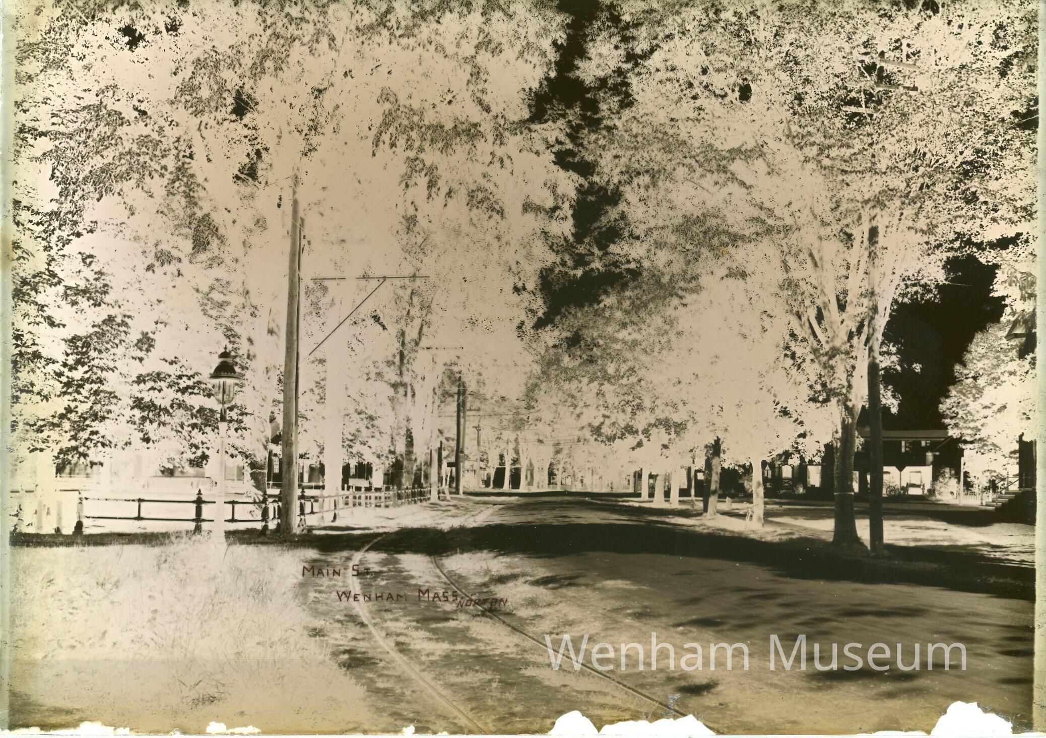 Main Street, Wenham, photo taken by A.B. Norton showing Monument Square and gas light (left). Trowt's store is at the right.