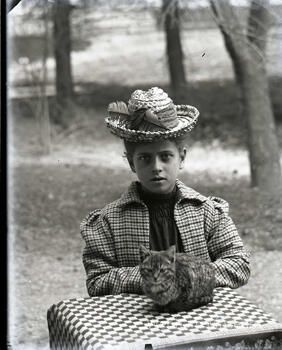 Eva Stanley sitting by a table with a kitten.