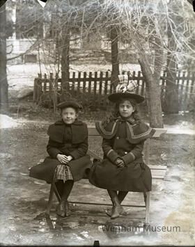 Eva Stanley and Ruth Homan seated on a bench outside in the snow. One wears a large hat with an enormous bow.
