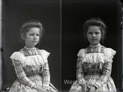 Duplex portrait photograph of Carrie Stanton as a girl. She wears a dress with an interesting collar.