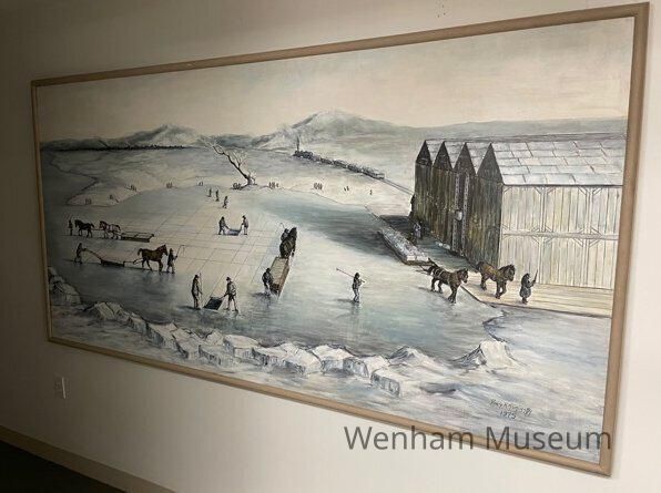 Oil on Board depiction of Ice Harvesting in blue/gray tones. Image inspired by an engraving/photograph of Ice Houses on Wenham Lake.