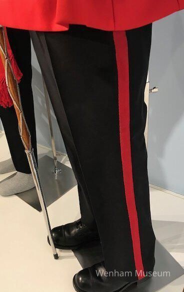 Black polyester trousers with red stripe on side. Hemmed at cuff. Zip fly with a button and hook and bar closure. Pockets sewn shut. Front pleat. Belt loops. These pants were part of the offical Regimental Band of Wenham uniform and were worn with a red tunic, white belt, etc. David Clark's name is written in ballpoint pen in the waistband and on the pocket.Collection