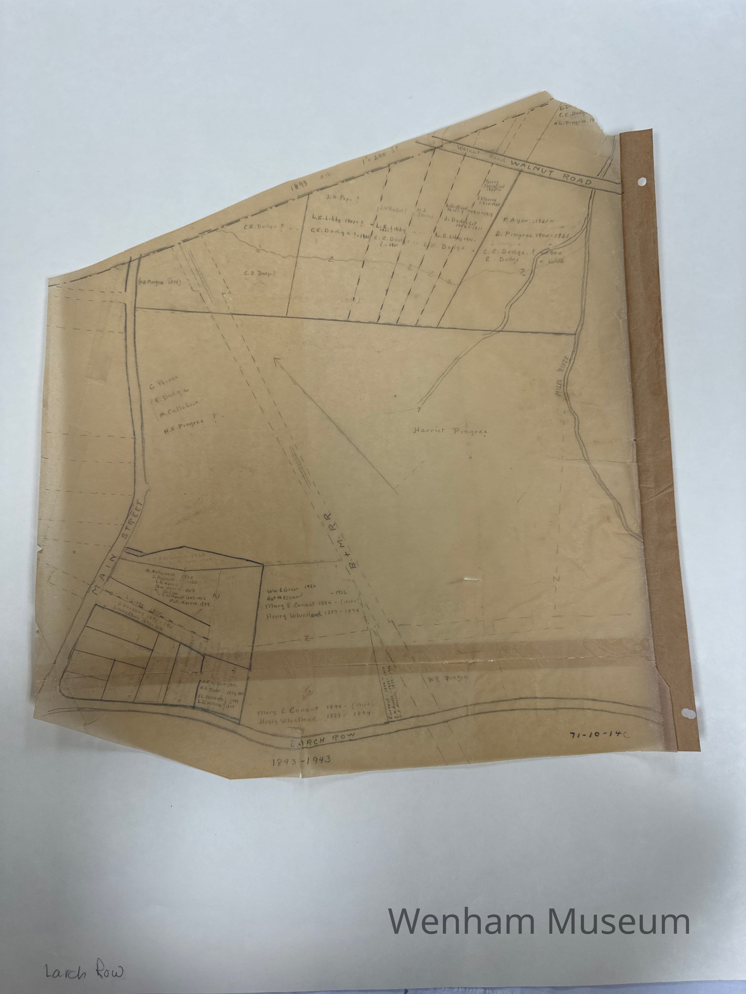 Four small maps triangular shape in pencil probably prepared by Ruth Torrey. Portion of land brodered by Main Street and Larch Row. 1743-1793, 1793-1843, 1843-1893, 1893-1943.