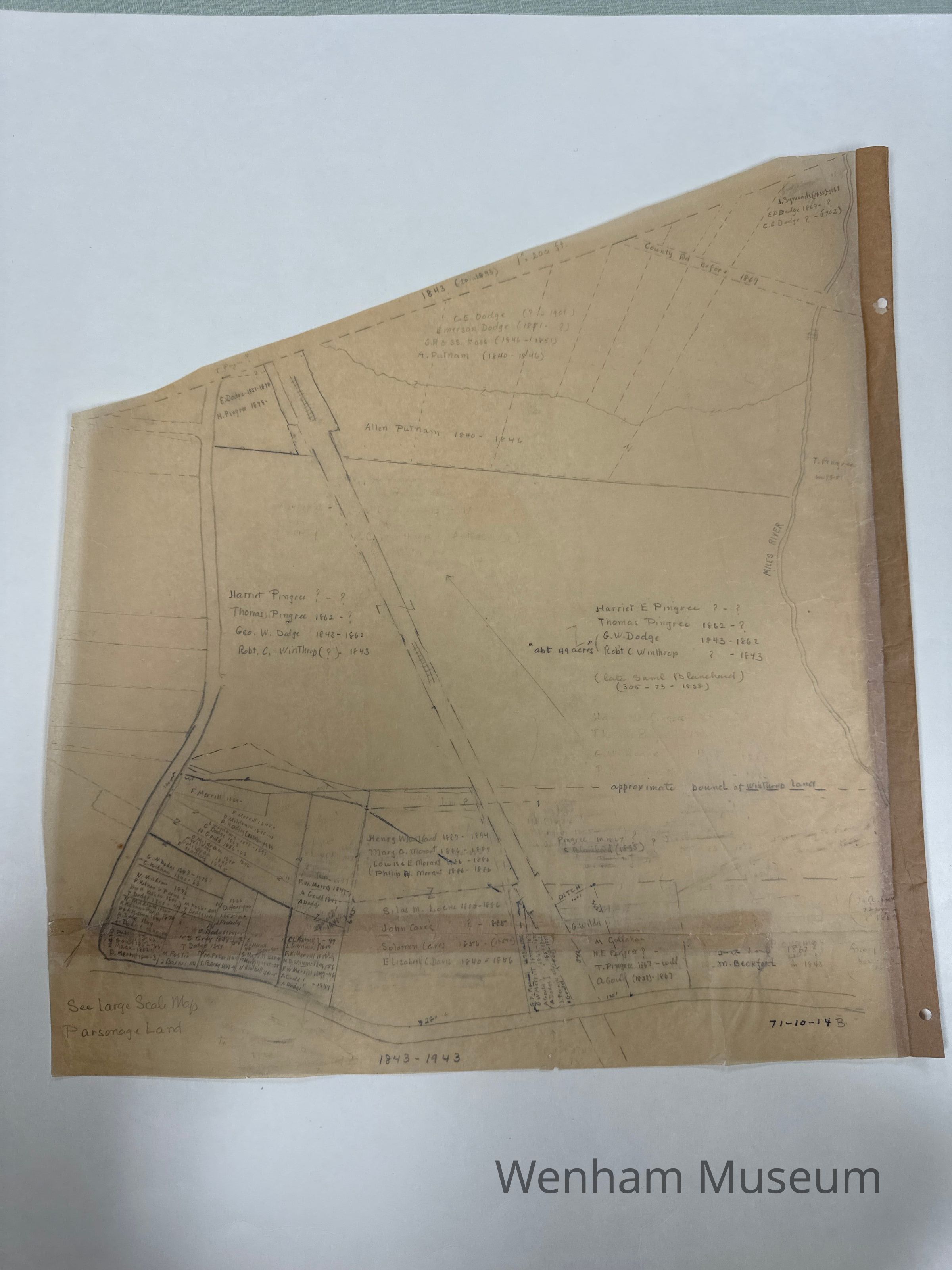 Four small maps triangular shape in pencil probably prepared by Ruth Torrey. Portion of land brodered by Main Street and Larch Row. 1743-1793, 1793-1843, 1843-1893, 1893-1943.