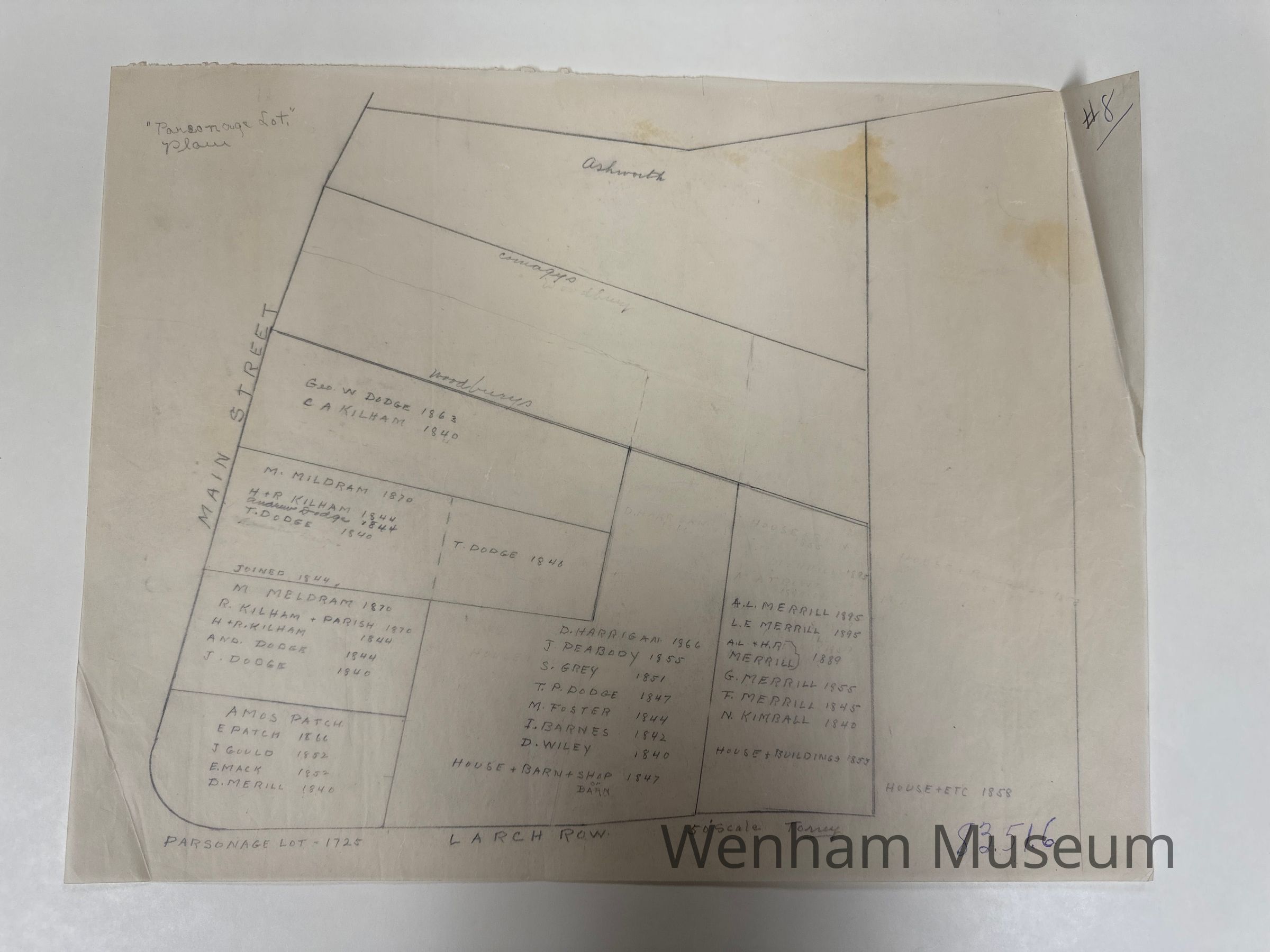 Main Street and Larch Row with dates of onwership. Wenham. Parsonage Lot
