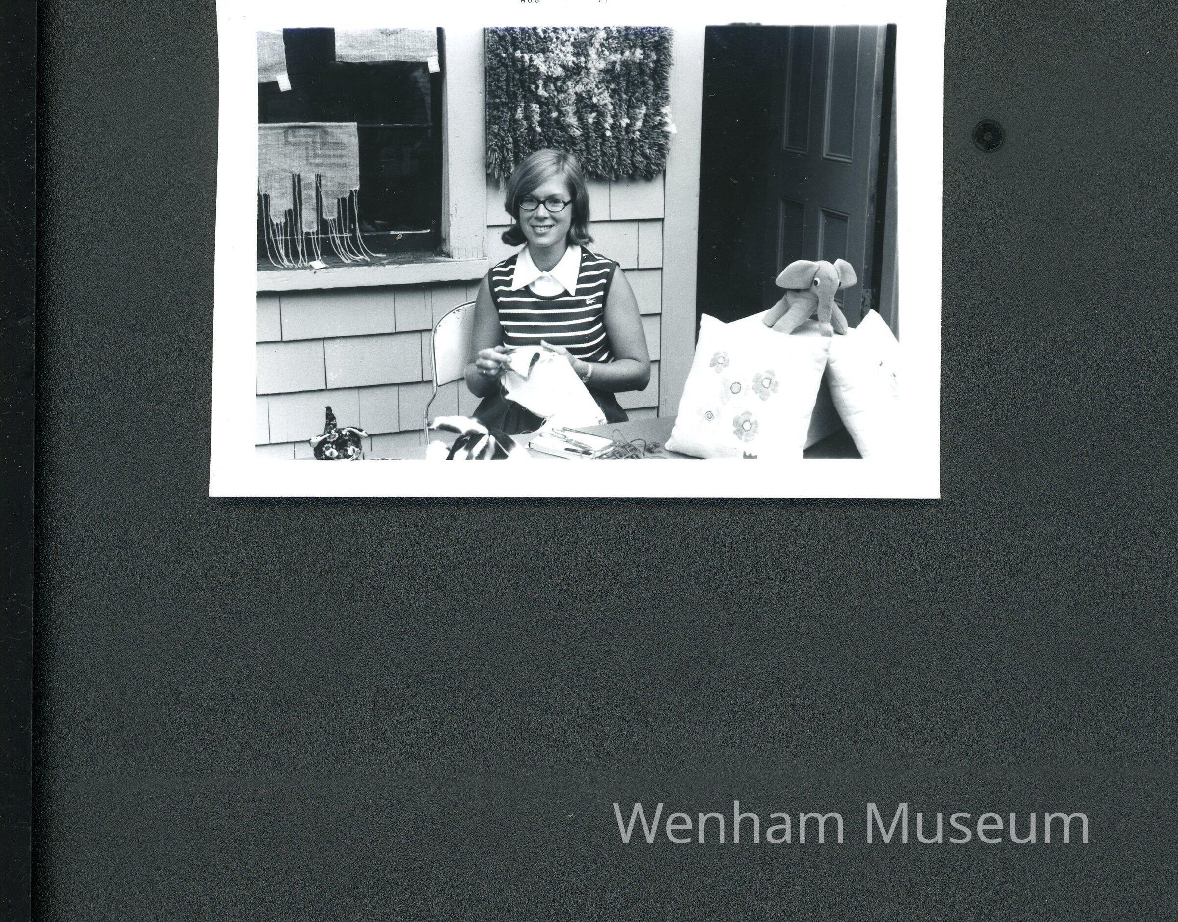 1974 photograph of Mrs. Calvin Cook at the Wenham Museum Craft Fair. Mrs. Cook was on the committee. She is shown at the stitchery, embroidery and toy table.