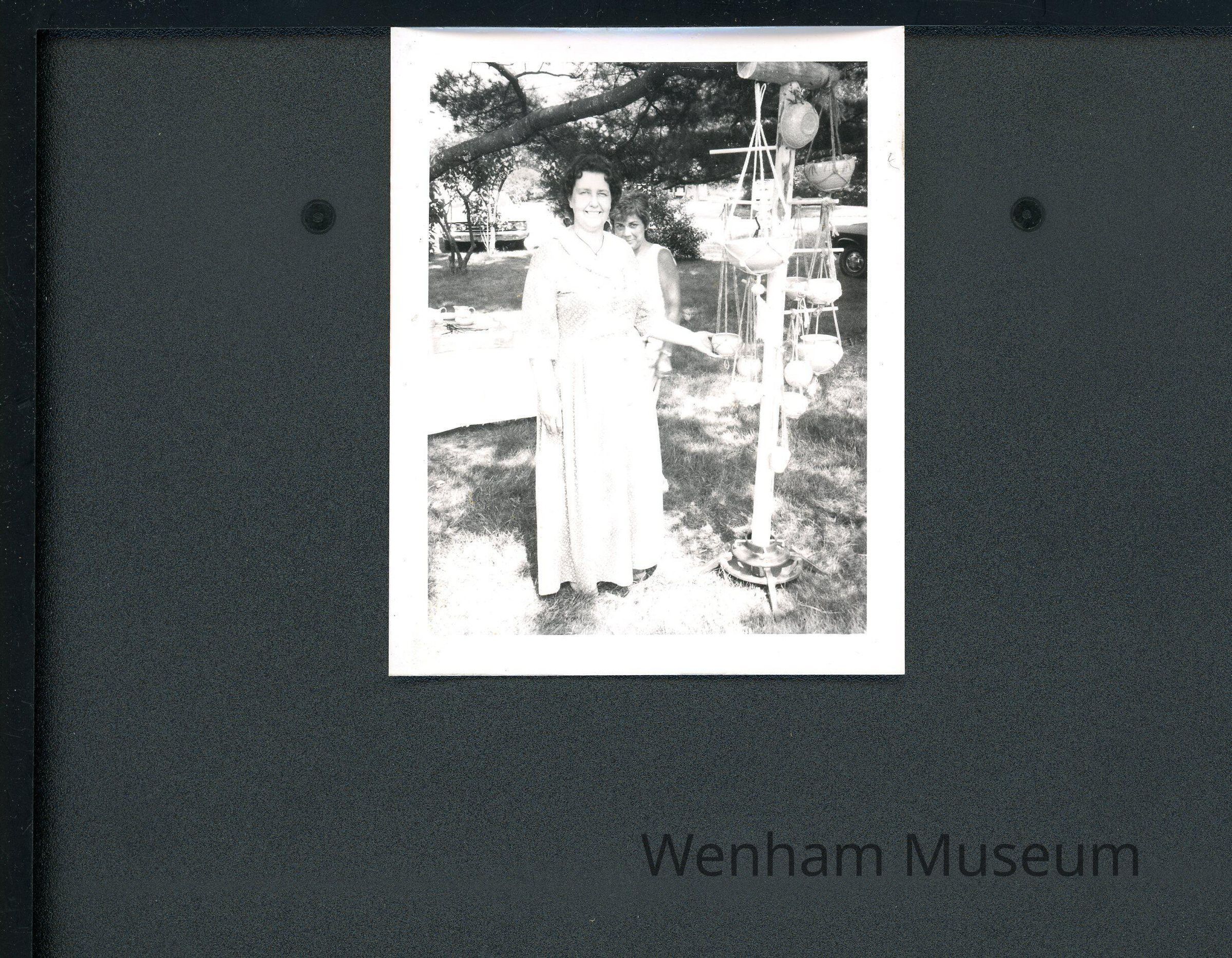 Undated photograph of Rena Pardekas and two girls at the Wenham Museum Craft Fair. One girl is painting a plaque according to the note on the back of the picture. Rena Pardekas and the other girl are dressed in period costumes. Ms Pardekas lived at 196 Linebrook Road in Ipswich.