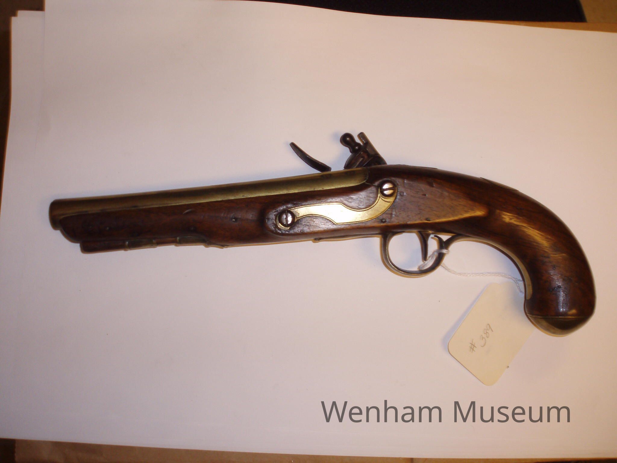 One of two duelling pistols made in London by W. Ketland & Co. .56 Caliber Flintlock, brass barrel and trigger gaurd and butt end. Restored by Harold Boothroyd in 1973 - see conditon notes.