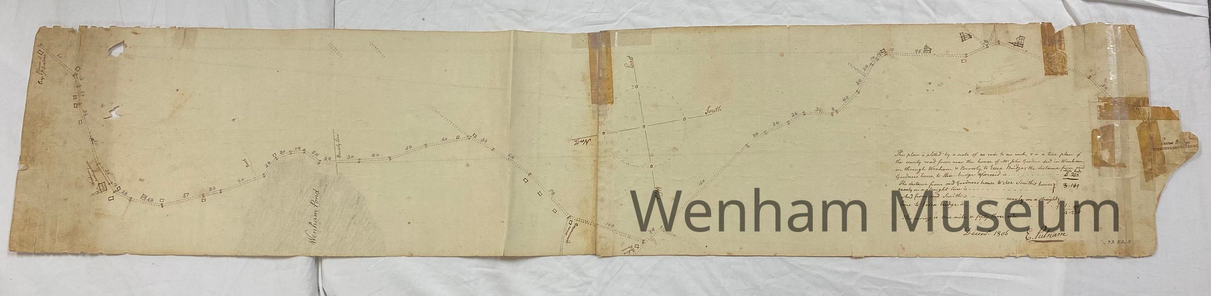 1806 map showing the route from Wenham to the Essex Bridge (Beverly-Salem Bridge) in Beverly. The map is hand-drawn by E. Putnam and shows landmarks like churches and houses. Only a few of the buildings are named - including Wenham Meeting House and the Essex Bridge. The map starts in Wenham at the house of John Gardner - noted as Mr. John Gardner dec'd. Gardner died in 1805 (Wenham Vital Records). On the reverse is the map/plan title and the name Jacob Dodge.