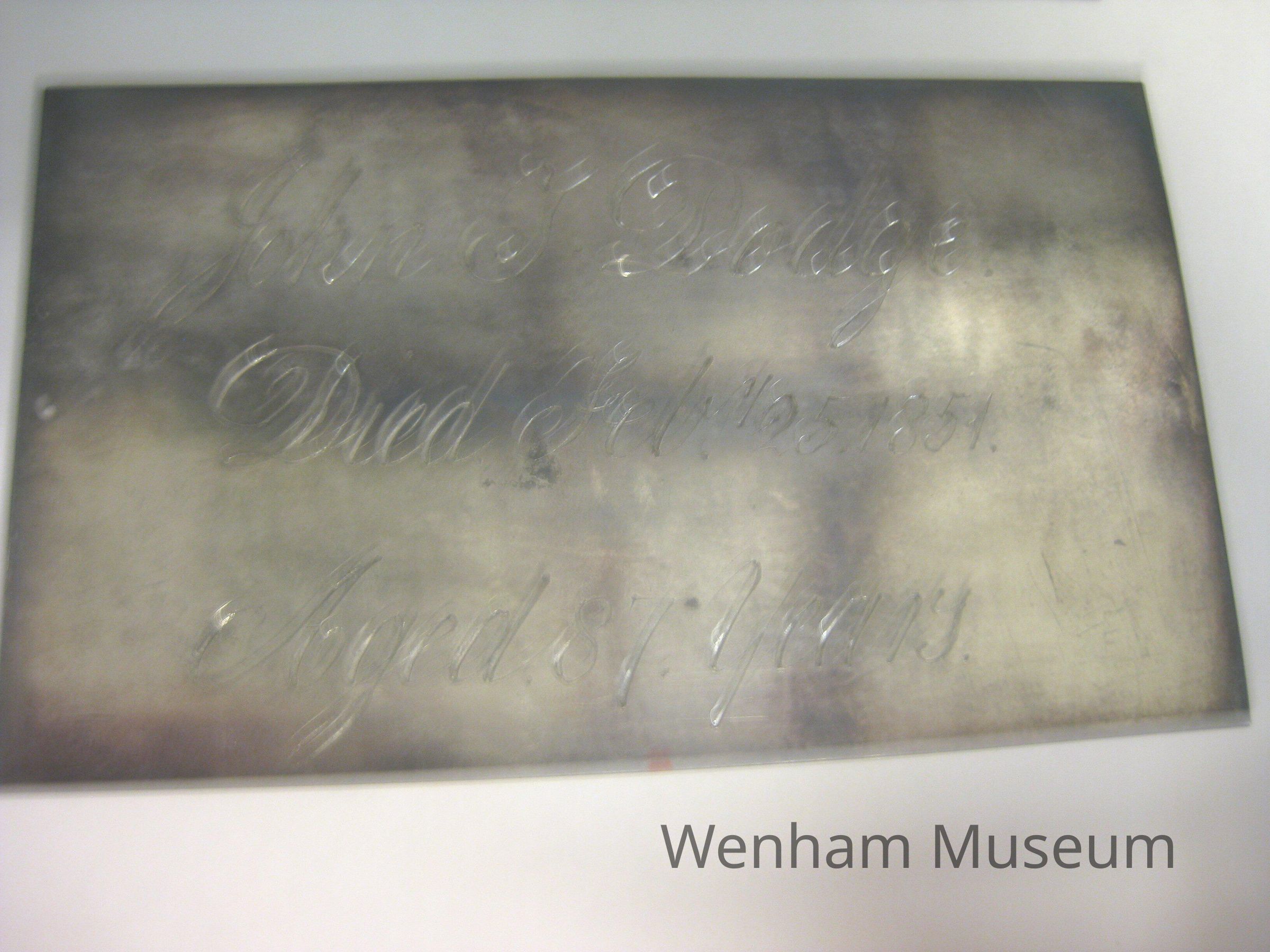 Two coffin plates. Silver metal, probably silver, but very tarnished. 1981.16.001A reads in engraved script "John T. Dodge. Died Feb y 25, 1851. Aged 87 Years" 1981.16.001B reads in engraved script "Mrs. Elizabeth Dodge. Died Jan y 20, 1851. Aged 84 Years."