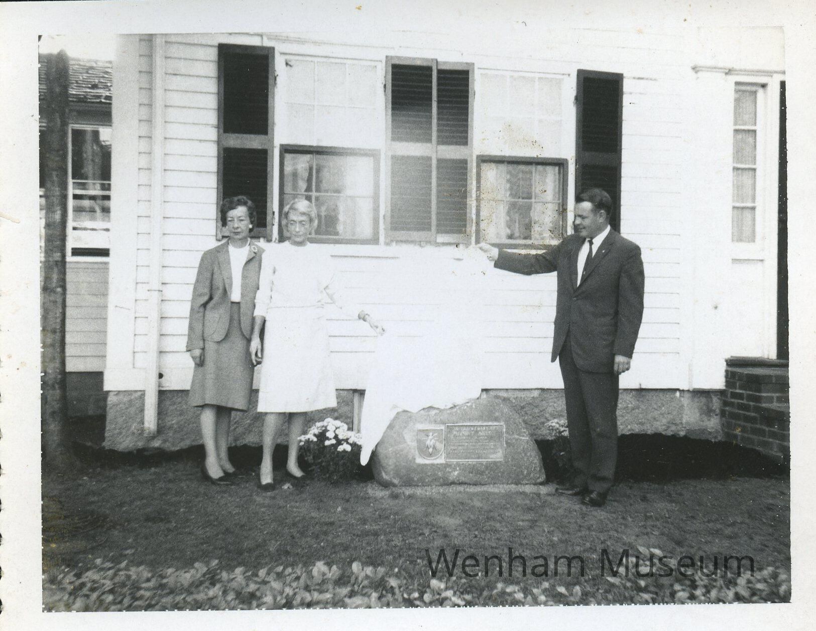 Black and white photograph of plaque honoring Henry Alley (1835-1908), famous beekeeper and author. Plaque location 14 Larch Row, Wenham, his original homestead. Pictured in the photograph from (left to right) Muriel B Holmestrand, Katherine Marshall, and William Wiley of the Essex Co. Beekeepers Association.Collection