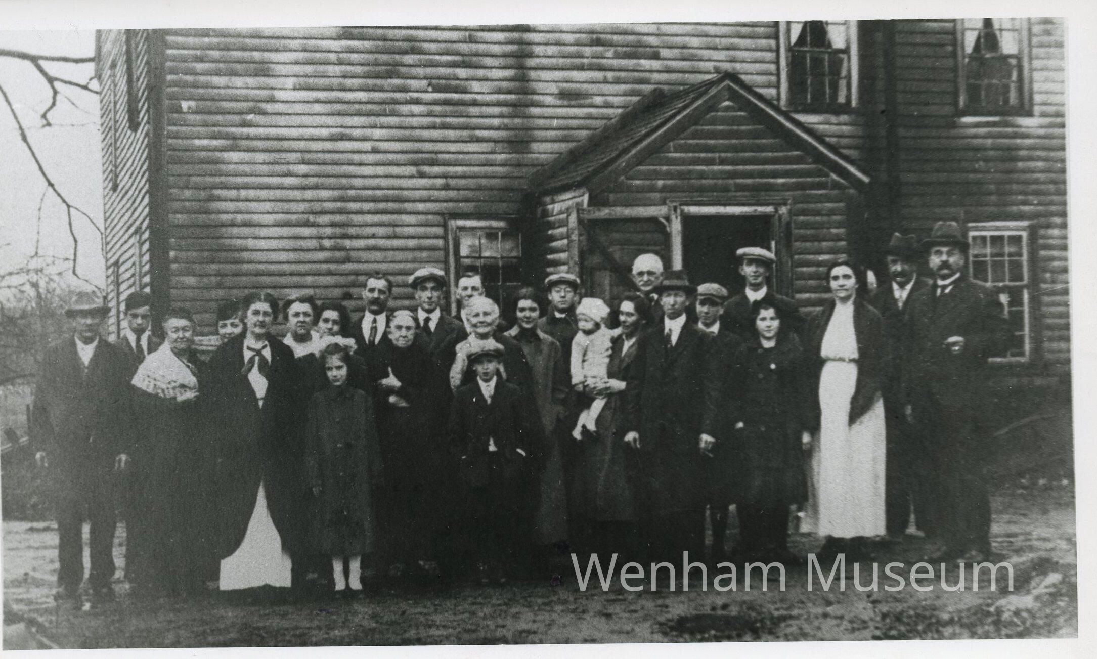 Black and white photograph of a family group at Sumner Brown's house, Topsfield Road, Wenham, on Thanksgiving, November 30, 1916. *attached listing in notes section lists all of the people in the photograph* November 30, 1916