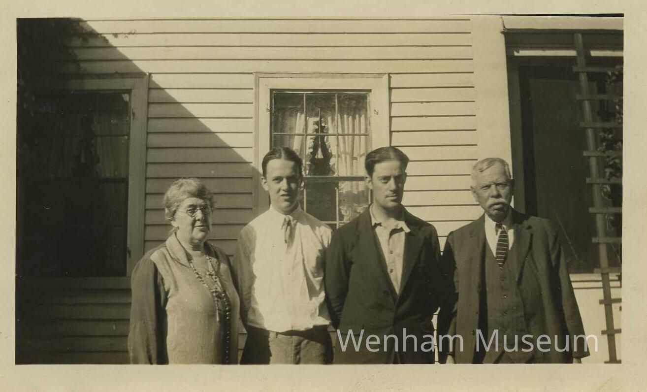 Black and white photograph of Florence Ellen (Lefavour), Owen I., Roger B., and Harry W. Haszard at 13 Larch Row, Wenham. June 30, 1927.