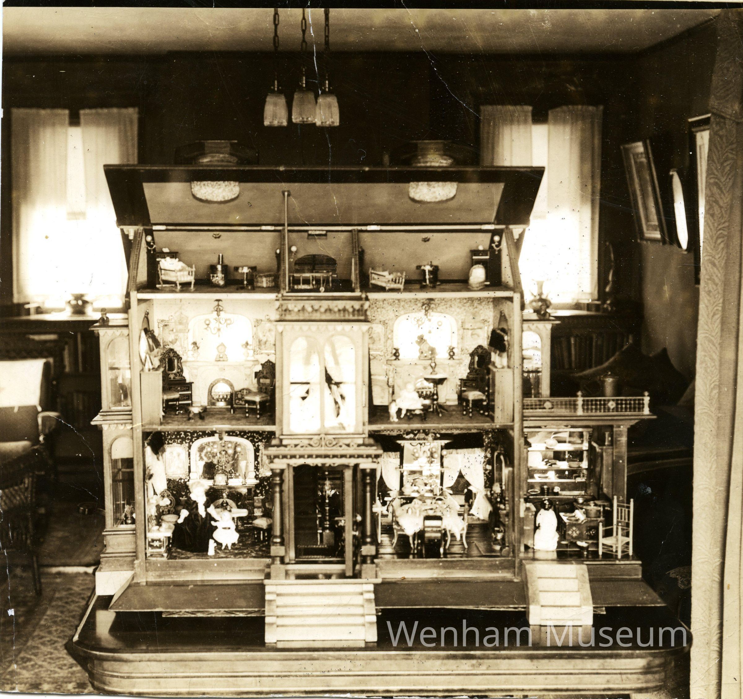 Sepia toned photograph, 5.75 x 5.5" , of a doll house on a table in a living room or parlor. Reverse of photograph, in pencil: "Made by Benjamin H. Chamberlain / of Salem, Mass. Home was started / in April 1884 and finished Dec. 24, 1884 / 1056 / Sold to Wenham Museum / Properity of Mary E. Chamberlain / 119 Washington St. / Marblehead / Mass,."