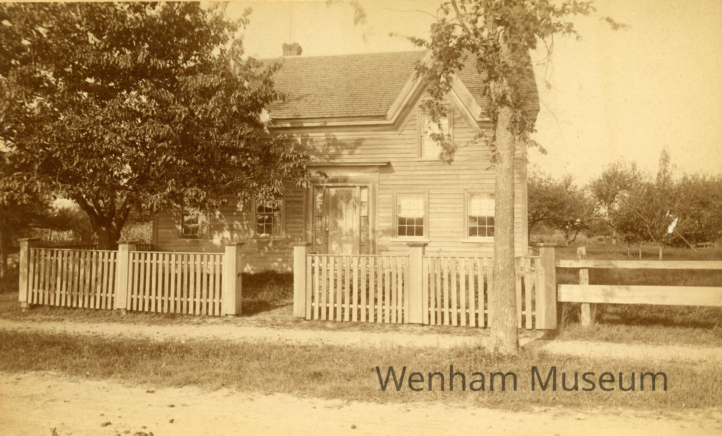 Albumen print mounted on cardboard, reverse of mount in pencil: "Folsom House / Cedar St. / Wenham / Mass.." Written in ink: "Nov. 1970 this is / #10 Cedar St. / January 1970 This is the present / Cook house, occupied by / Ina Cook & her husband's sister, Ida Killam C.Jones research / In the early 1900's this house was used as a Maternity Hospital for a few years / C.Jones."