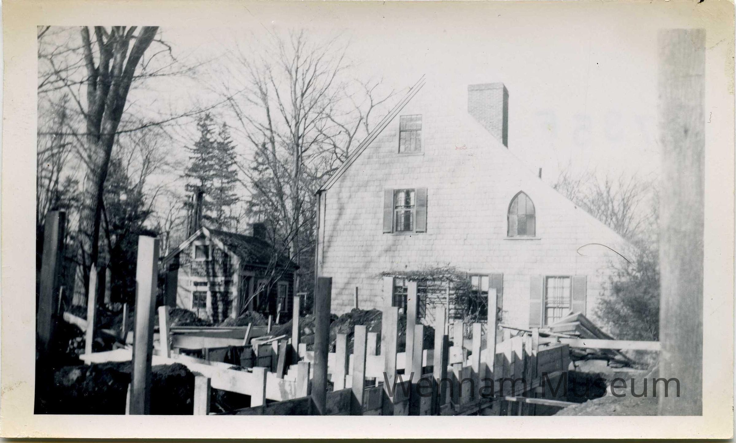 Construction of main museum building next to the Claflin-Gerrish-Richards House (CGR House) during renovations in the 1950s, taken by Louis Dodge, verso of photo has handwritten note that reads: "Gothic window came out / of some Baptist Chapel / Wenham Neck, maybe. / Arthur Leach probably / gave it. He transformed / a church building into / house which he lived in / with his wife, mother, Mrs. Chas. / (Mary) Leach and aunt / Adeline Wilkins"; part of his photo collection called "Laying of the Cornerstone and building of the Museum"