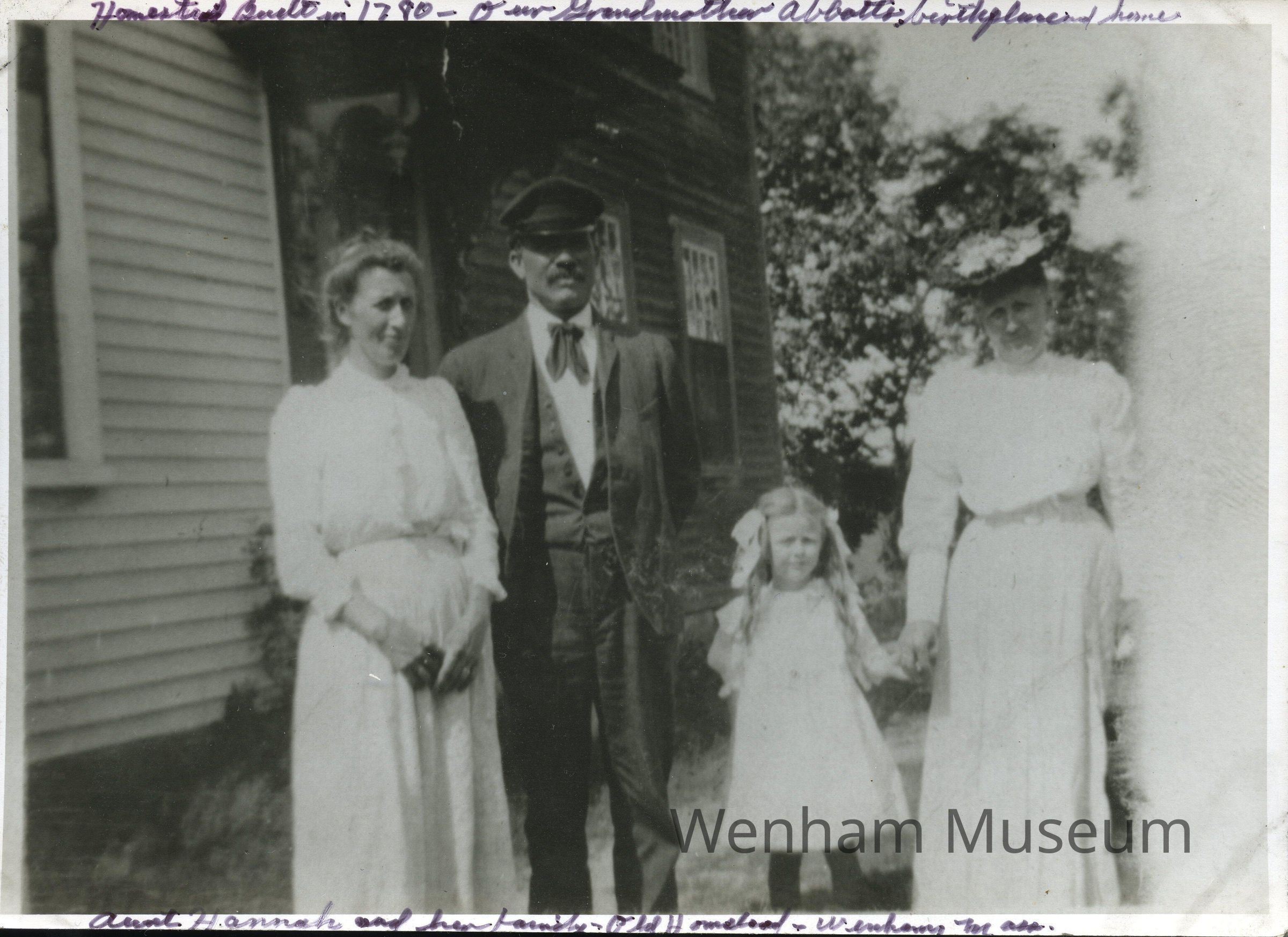 Black and white photograph of 80 Larch Row, Wenham, July 7, 1907. Pictured from left to right: Hannah T. Crowley and Irving L. Burnham with the Daleys.Collection
