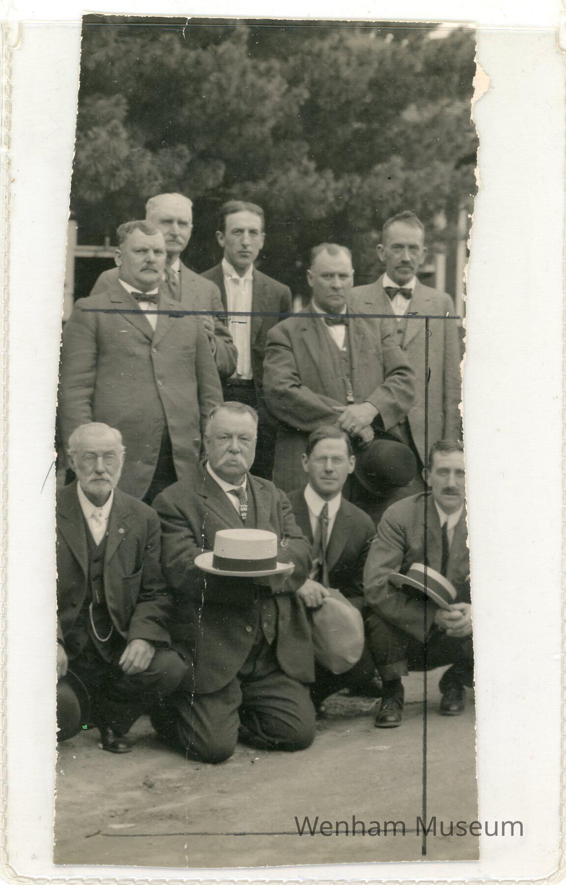 Print, black & white, 5 x 7," of a man holding a straw hat, identified on back as:"Center- / -Levi S. Lord- / Men of Wenham at / Outing at Canobie / Lake, N.H. on July 21, 1915 / man at left is / Benjamin F. Young, / Civil War Veteran. / Man at right is / W.Arthur Trowt / Son of William F/ / Trowt half owner / of Trowt's Store / Wenham, Mass.."