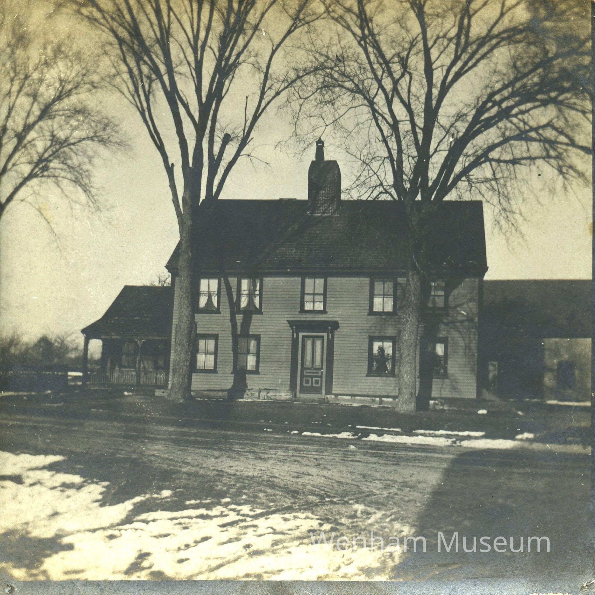 Black and white photograph of the James Friend/J. Wessel/B. H. Tracy/A.C. Stevens house at the corner of Cedar Street and Bomer Street (now Topsfield Road) circa 1880 Wenham, MA. (negative in file)Collection
