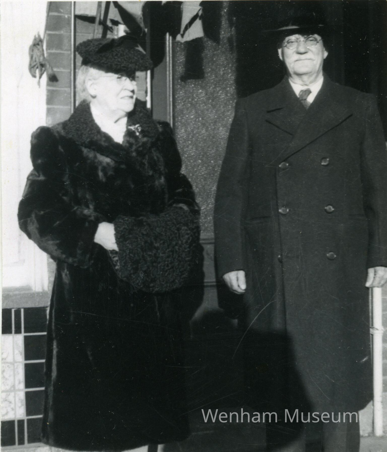 Print of "Grandma & Gramma / Wenham / 1944 / Albert Thomas Wenham / Ellen Louisa." Print was once cut, left half gone. Ellen Louisa wears a fur coat and has a fur muff, Albert Thomas wears an overcoat and fedora.