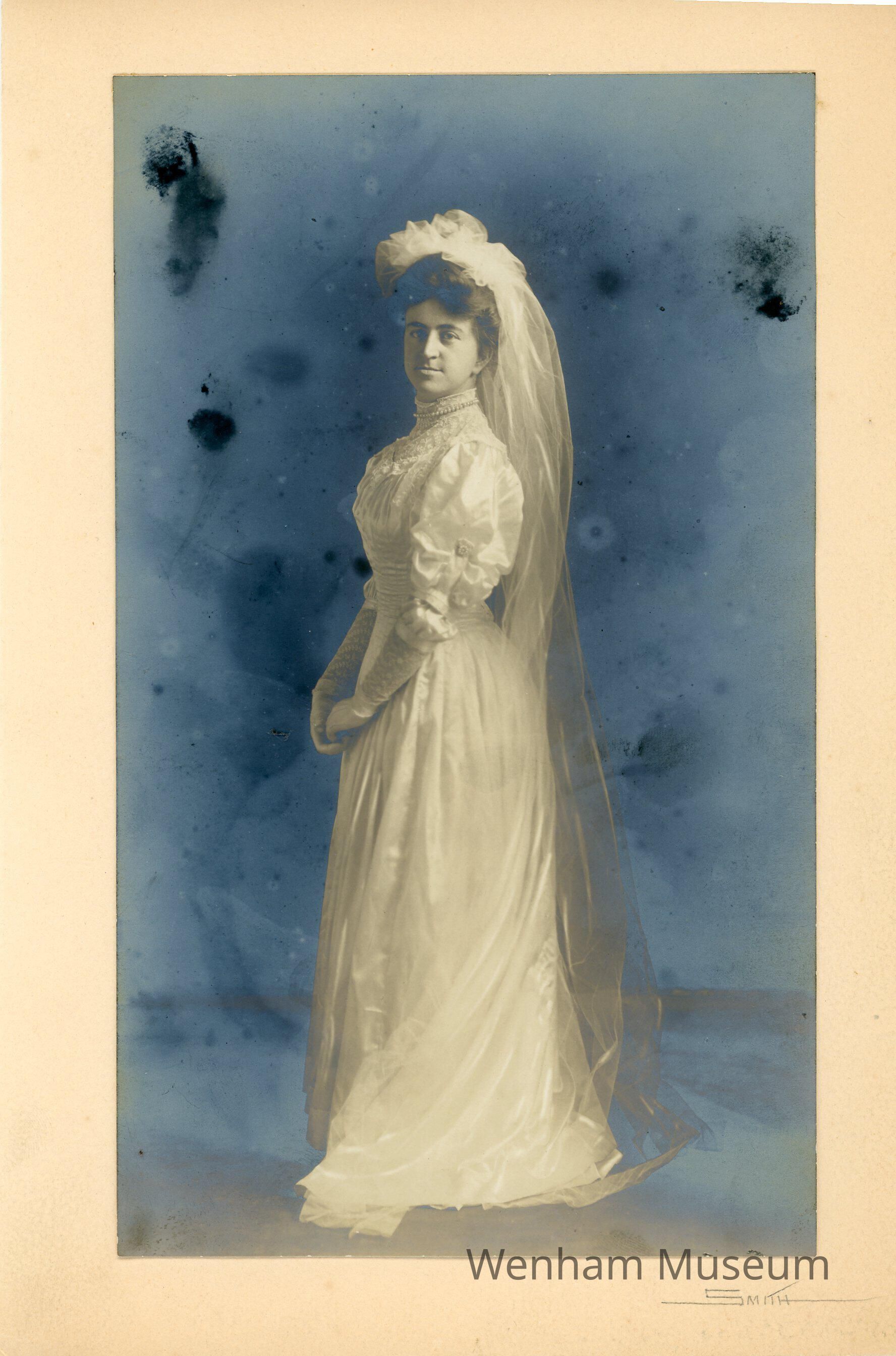Photograph of Alice Boutwell Dodge Prince in her wedding gown. She was the daughter of William Preston Dodge. She married Arthur Dodge Prince on November 21, 1907 at the Dodge home on Larch Row in Wenham. The wedding gown is 1970.21.038A