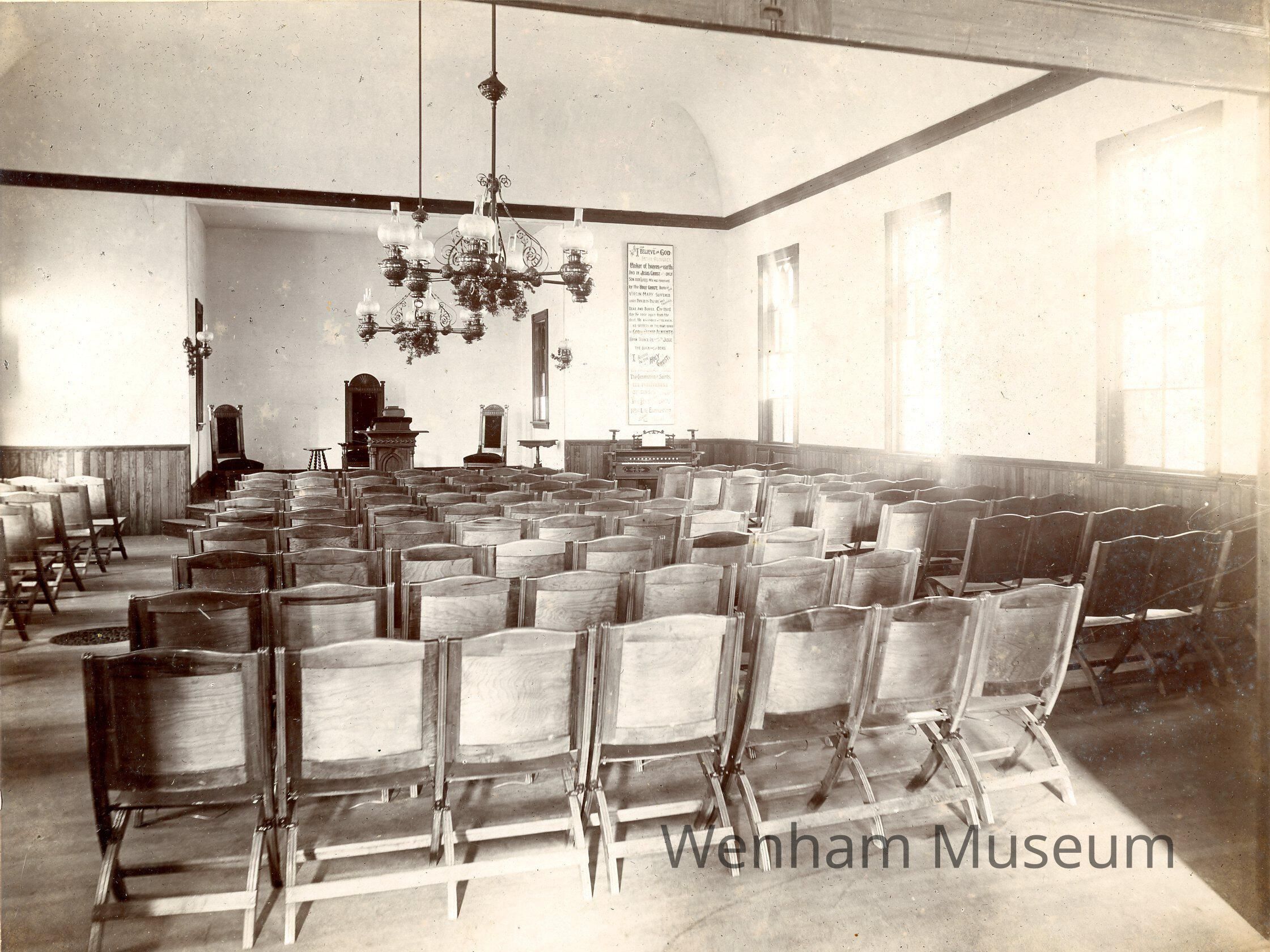 Mounted albumen print of Conant #00344, glass plate negative missing "Interior view of Wenham Union Church, Wenham Depot, So. Hamilton"