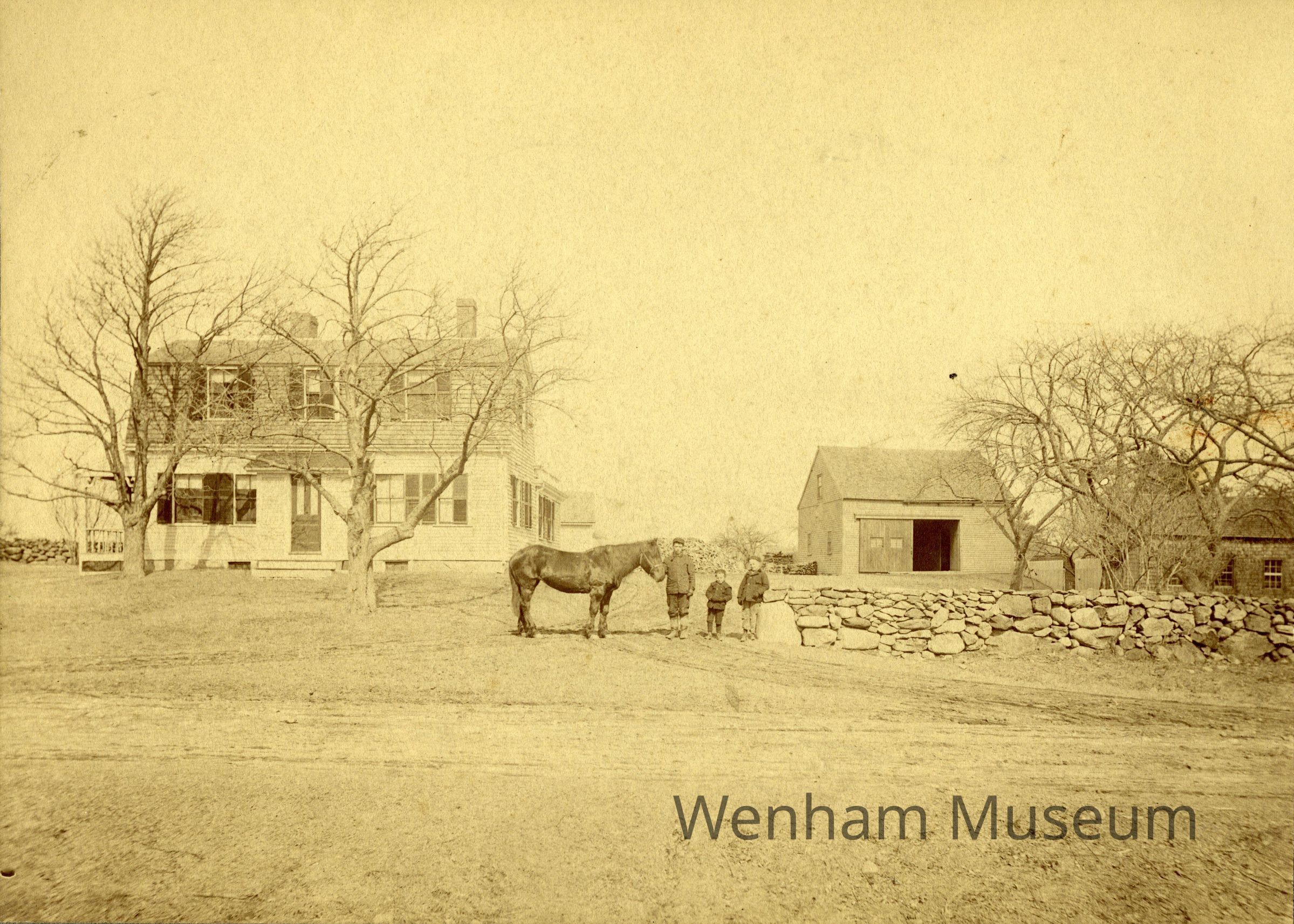 Albumen print mounted on cardboard, cardboard broken, back of print: "Luther Batchelder House / Topsfield Rd. / Wenham / (W.A. Trowt)." Print includes the home, barn or shed, a horse, three children and a stone wall.