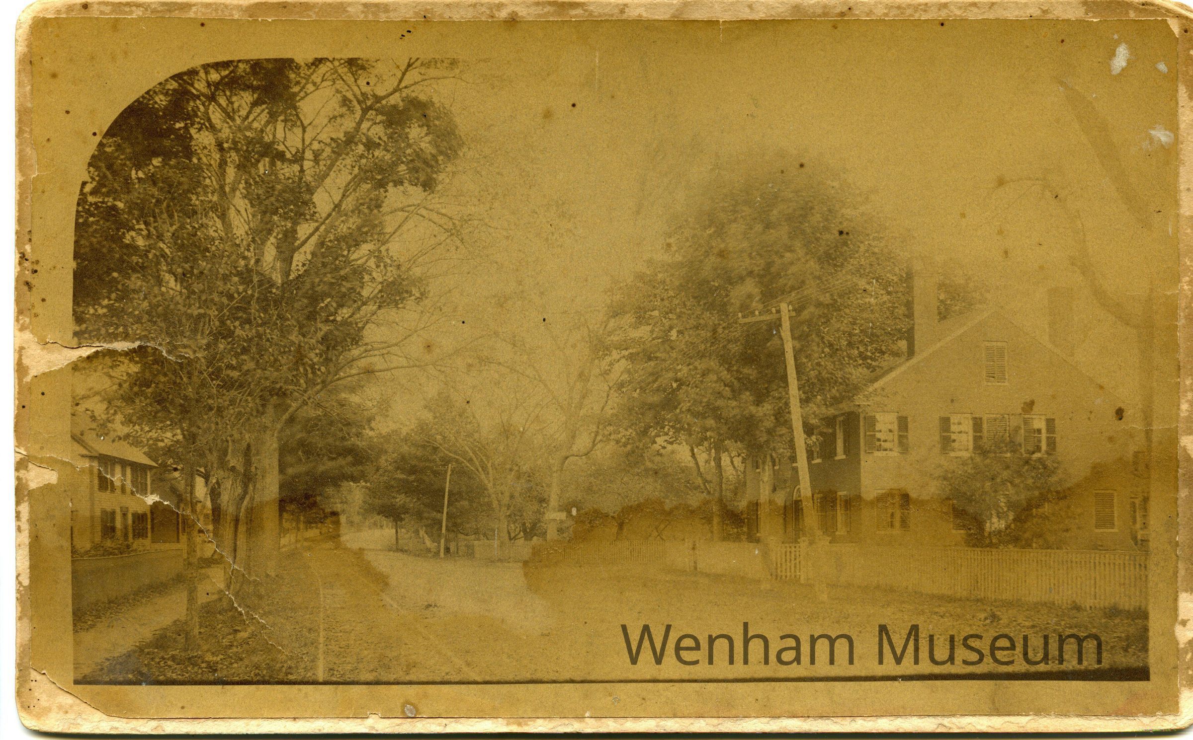 Albumen print mounted on cardboard, very bad condition. Back of photograph in pencil: "View looking East along / Main St. Wenham, Mass. / Showing Lummus Tavern / on corner of Larch Row."