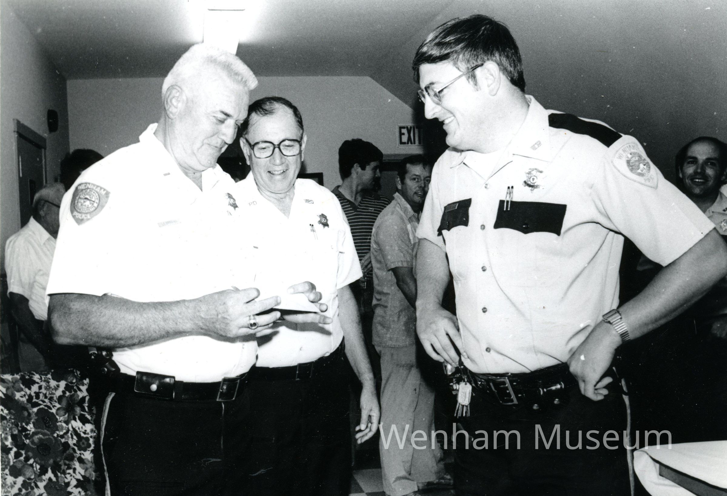 Print, 5 x 7.75, of men from the Wenham Police Department including: "L to R.:Frank A. Corning / Lawrence E. Kavanagh / Chief Edward A. Haraden / Peter Carnes at rt. / Hamilton-Wenham Chronicle Photograph / Wenham Museum Collection / Sept. 1981."