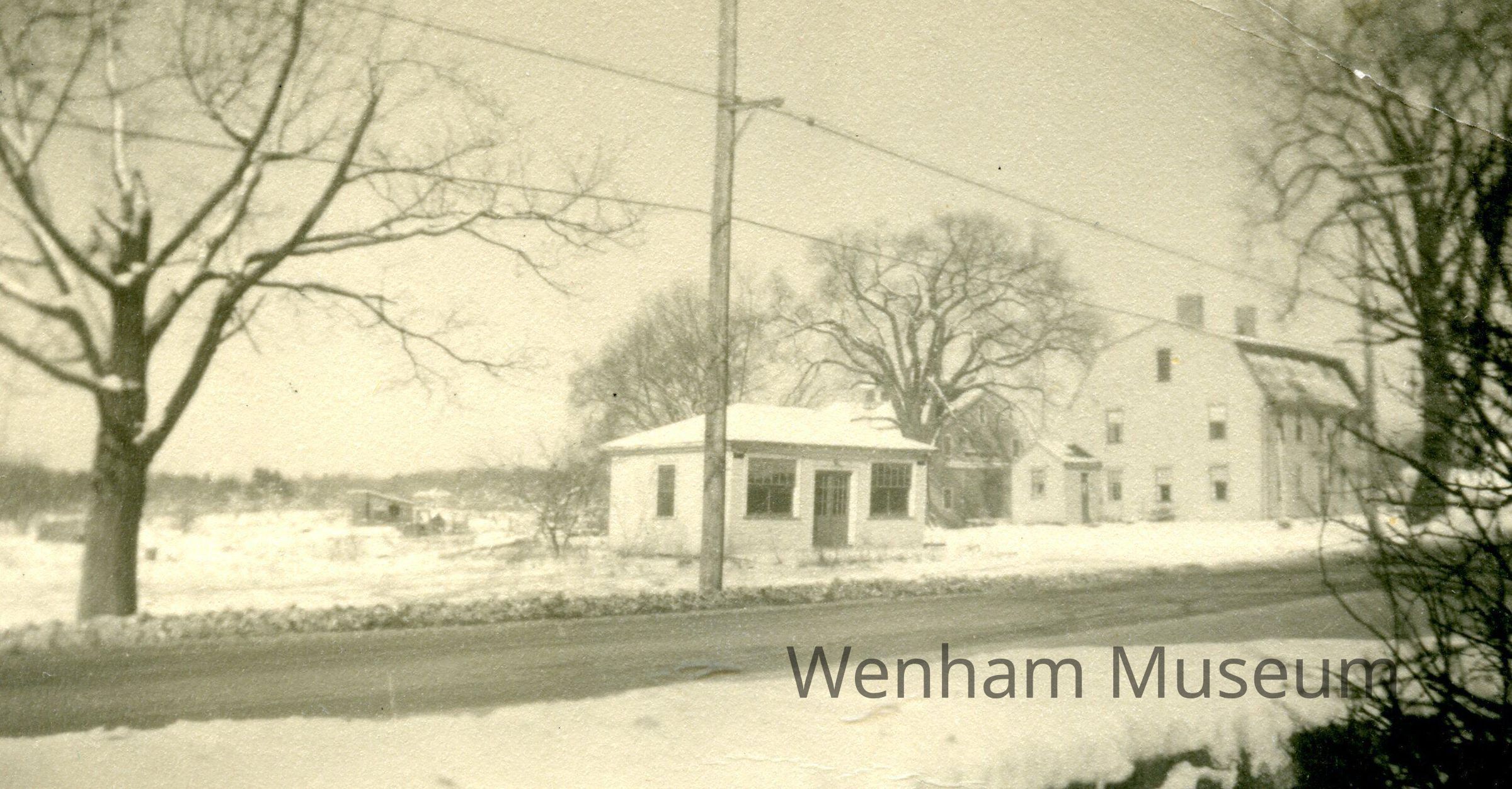 Print, 2 1/8 x 4.5," of a small, shop building and a house in winter. Back of print identifies only the "Porter-Fairfield House, 79 Main St., Wenham."